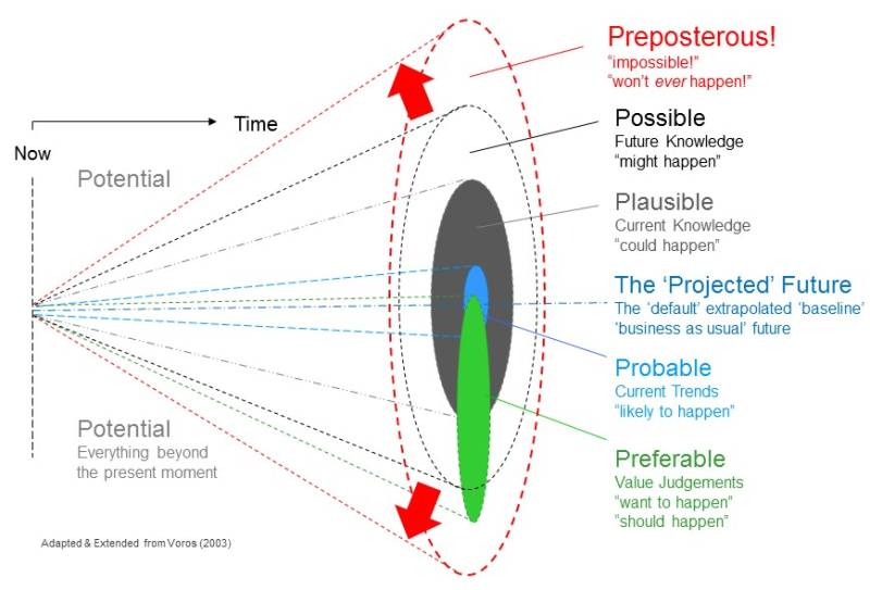 - (Predicted) – the future that someone claims ‘will’ happen. I briefly toyed with using this category for a few years quite some time ago now, but I ended up not using it anymore because it tends to cloud the openness to possibilities (or, more usefully, the ‘preposter-abilities’!) that using the full Futures Cone is intended to engender.”