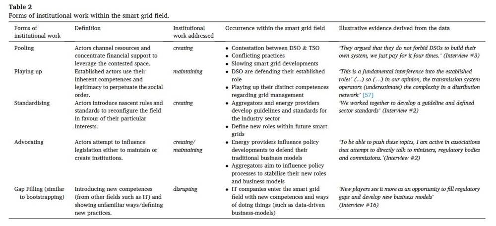 “The heterogeneity of organisations ’ aims, interests and belief systems, as highlighted by our examination of institutional work, are key to understandingwhy smart grid developments lag behind initial expectations. The rules (e.g. who gets access to the market) and roles (e.g. who should handle the data and/or who should manage grid flexibility) in future smart grids are not clearly defined and thus highly contested among the organisations. The struggle is much more about an individual organisation’s interests than about a wider governmental and/or public debate [66] as to what constitutes a smart grid, the main purpose it should serve and how it could be organised.”