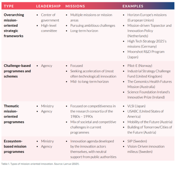 “While many factors influence missions, current evidence indicates that mission-oriented innovation is often enabled by three interlinked policy structures: institutional entrepreneurship and mission governance, funding missions and public procurement.