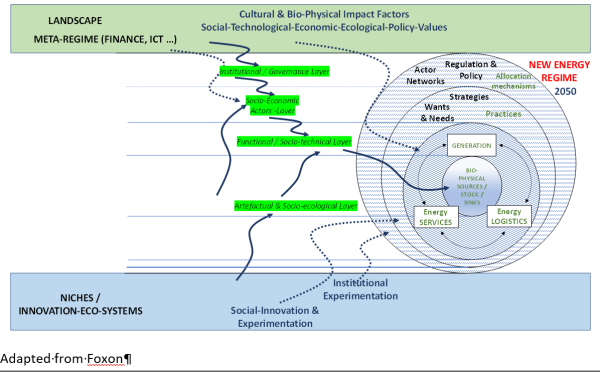From below, niche-developments, as components of system innovation, play a role in changing the future Energy Regime. Niches, or Innovation-Eco-System, provides the space for and drivers of change in terms of institutional, social, technological and business innovation and experimentation at the levels of institutional arena, socio-economic / socio-technical micro-levels and the energy infrastructure-level.